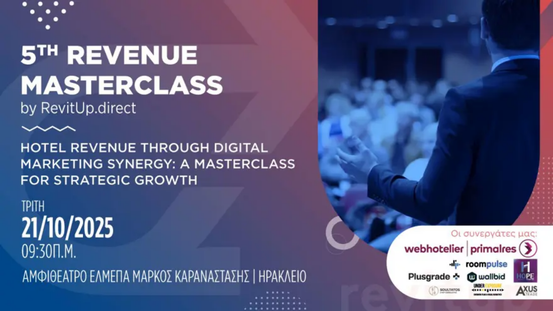 Το 5ο Revenue Masterclass από την εταιρεία Revitup.direct, με τίτλο «Hotel Revenue through Digital Marketing Synergy» έρχεται να αναδείξει πώς η τεχνολογία, τα δεδομένα και η καινοτομία μπορούν να μετασχηματίσουν τη λειτουργία και την κερδοφορία των σύγχρονων ξενοδοχειακών επιχειρήσεων.